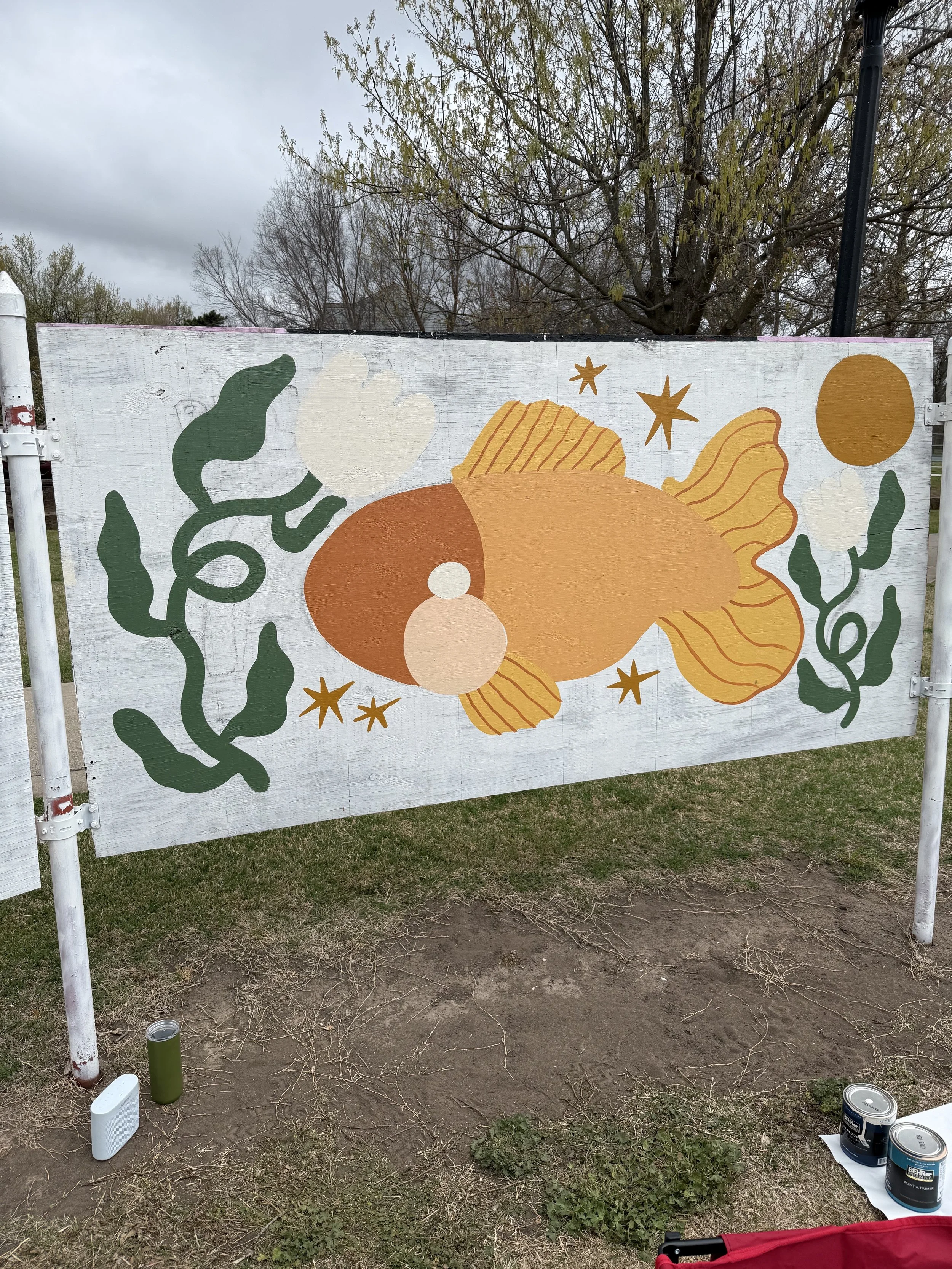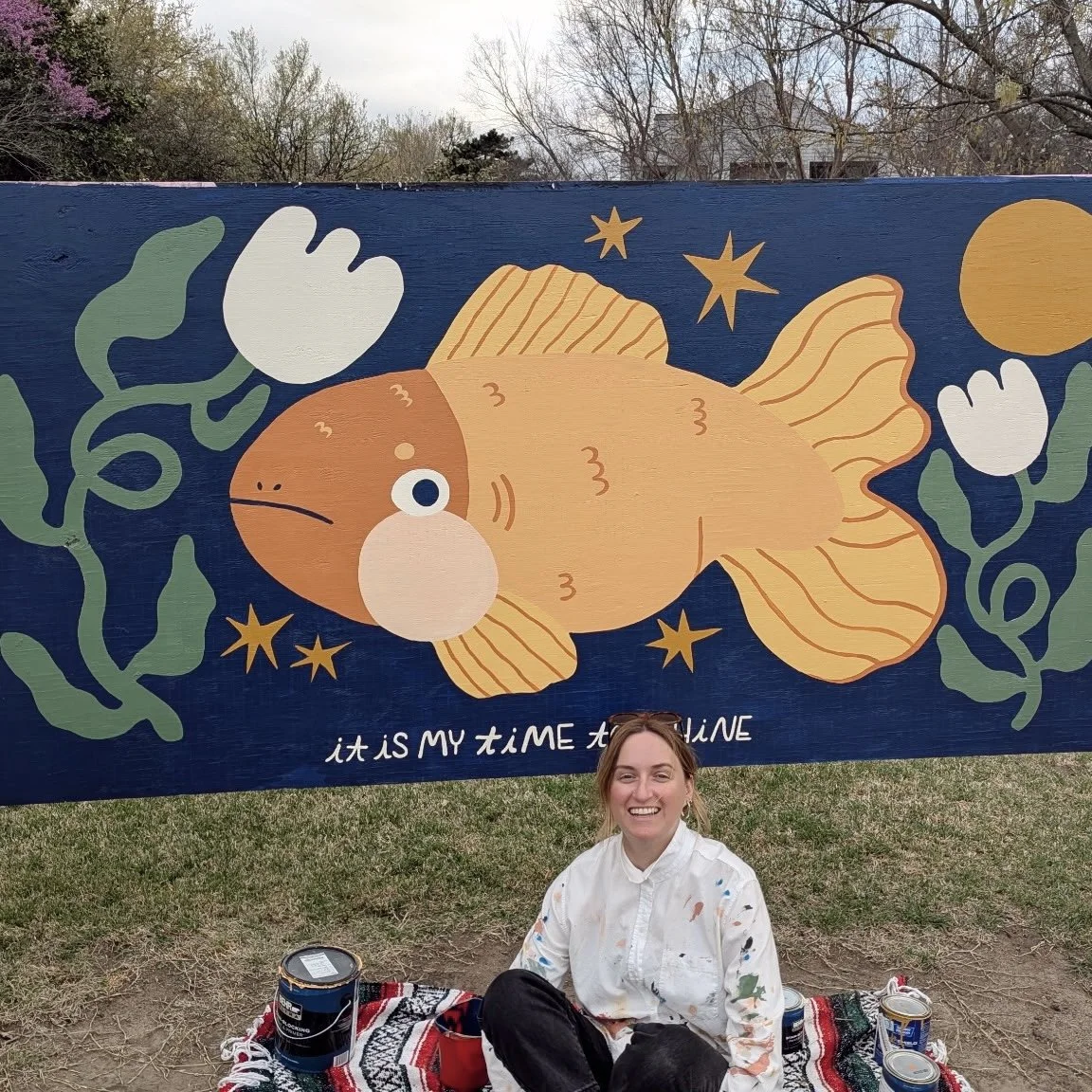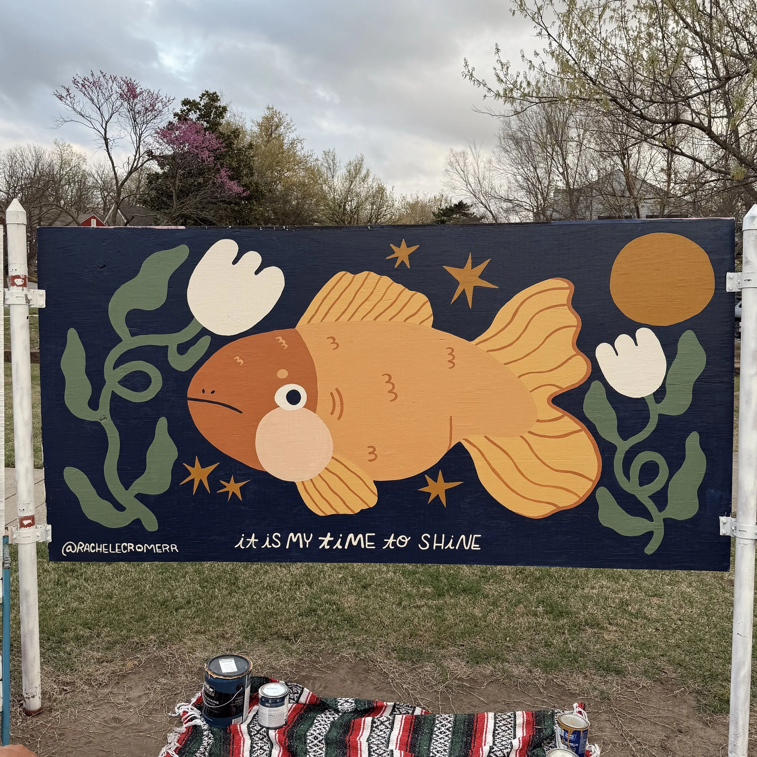 In March 2025, Norman Firehouse Art Center asked me to create a mural to join their mural wall on their grounds. The only ask was that it contained a pet, so I chose to paint a big happy goldfish. He’s surrounded by stars and flowers and is swimming in a dark blue background. Go see him at the Norman Firehouse today!